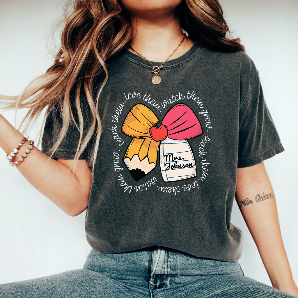 Crafted for parents, PTA organizers, and students who want to give a meaningful teacher gift, this shirt features a pencil-and-apple bow design with the teacher’s name and the touching phrase: